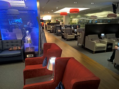 Terraces Lounges These are the old outstation product, and try and resemble a good sitting room mixed with a pleasanty middle class garden in Surrey. There are different areas with sofas to lounge around on, the classic blue tiled curvey bar with a trough for wine and bar stools. And initially most perplexingly, wooden garden chairs on stone floors around fountains. Incongruous, and yet this idea of the outside meeting inside is very calming and works well. Terraces Lounges are open to Club, Oneworld emerald and sapphire passengers, and Qantas club members.